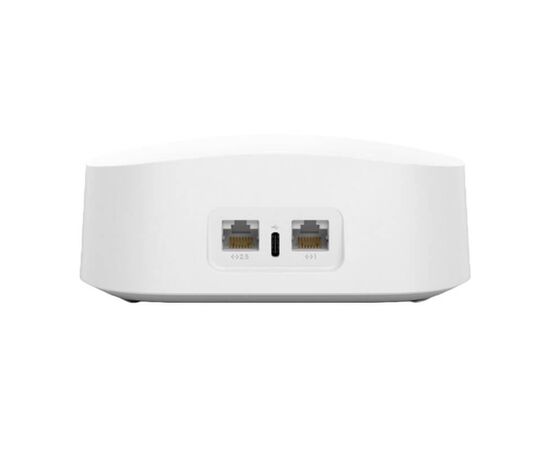 Изящная клиновидная форма корпуса идеально впишется в любой интерьер. Компактный размер и классический белый цвет не привлекает лишнего внимания. Устанавливают устройство на горизонтальные поверхности. На задней панели находятся два порта Ethernet и разъем под кабель USB Type-C для питания.
