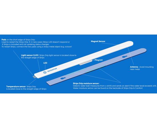 Датчик протечки и температуры Sensative STRIPS Drip ― SENEDRIP разработан для установки в местах, где существует риск протечки воды. Датчики протечки устанавливают возле стиральных и посудомоечных машин, под раковиной, в ванной комнате и туалете. Чувствительные сенсоры обнаруживают затопление на ранней стадии и посылают сигнал на централь, чтобы владелец дома смог своевременно отреагировать на ситуацию и не допустить начала потопа.