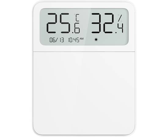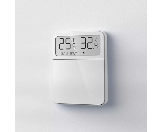 Выключатель оснащен дисплеем, на котором отображается дата, время, показатели температуры и влажности воздуха в помещении. Встроенный датчик влажности и температуры измеряет показатели и передает информацию другим устройствам умного дома, чтобы увлажнитель воздуха и кондиционер включались в случае отклонения цифр от нормы.