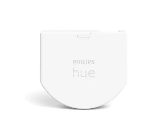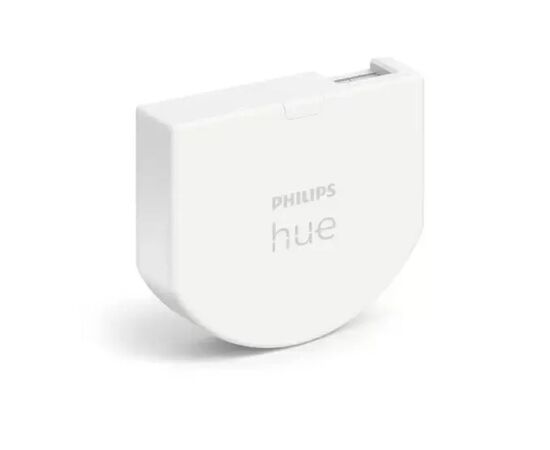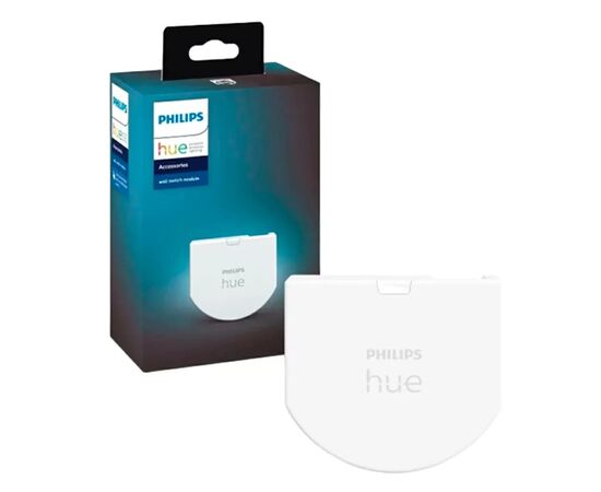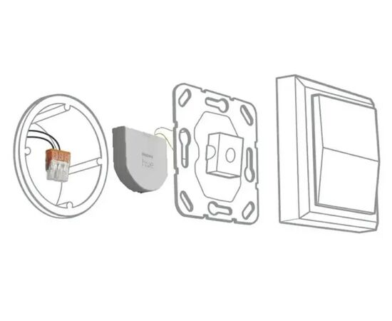 Philips Hue Wall Switch работает от батарейки, нейтральный провод не требуется. Перед установкой требуется сравнить размеры устройства с размерами монтажной коробки и убедиться, что модуль поместится под установленный настенный выключатель. Для управления умным освещением Philips Hue требуется блок управления Philips Hue Bridge.
