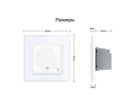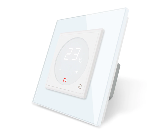 Терморегулятор предназначен для использования в любых видах помещений. С помощью устройства регулируется температура керамических панелей и электрического теплого пола. Лицевая панель регулятора сделана из стекла, информативный дисплей отображает точные показатели заданной температуры. Управление происходит с помощью прикасаний к сенсорному экрану устройства.