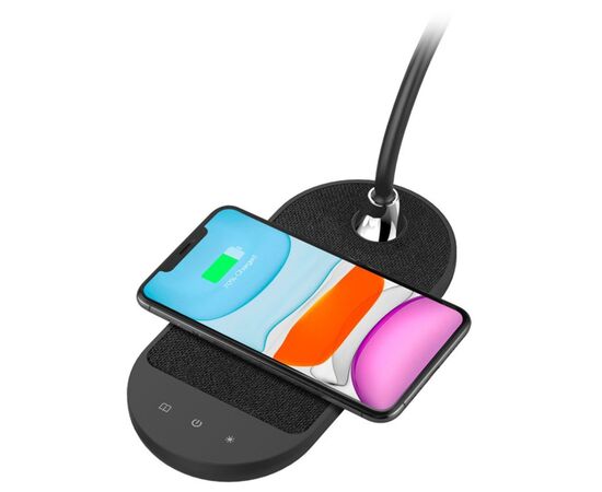Вбудована бездротова зарядка розташована під тканинною підставкою, на яку зручно класти смартфон чи навушники.