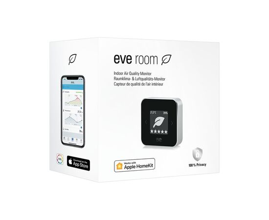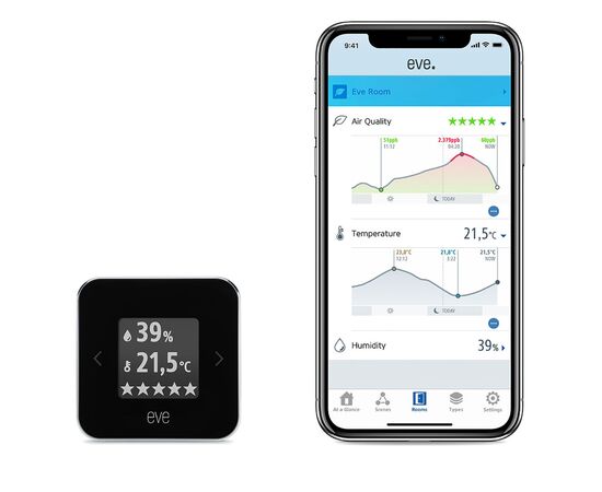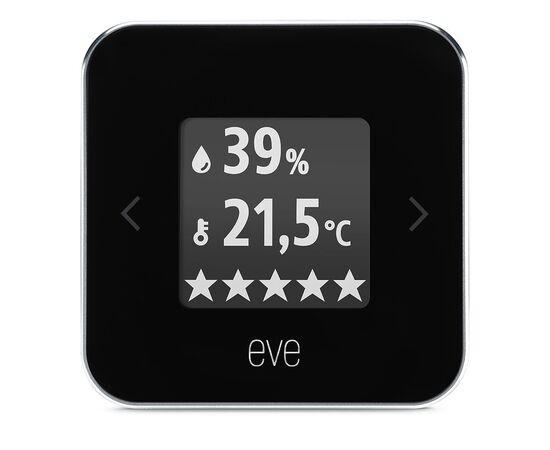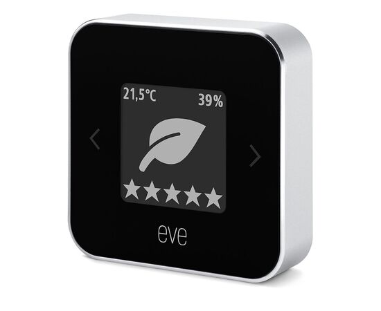 Датчик якості повітря Eve Room використовується для контролю чистоти повітря в приміщенні, щоб підтримувати здоров'я людей, які проживають в будинку. Пристрій відстежує вологість та температуру повітря, а також кількість шкідливих речовин. Зафіксовані дані відображаються на дисплеї.