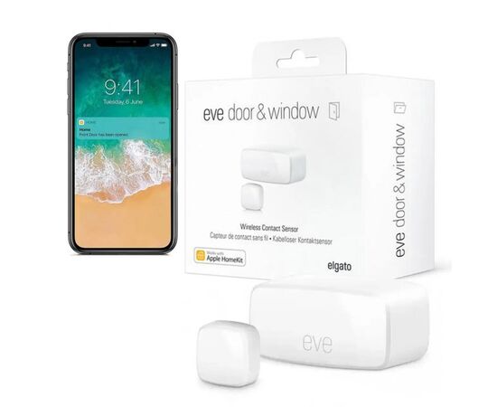 Elgato Eve Door and Window встановлюється на вікна та двері у приміщенні для дистанційного відстеження відкриття та закриття. Керування пристроєм та перегляд інформації доступні через мобільний додаток на iPhone або iPad. Датчик сумісний із платформою Apple HomeKit та підтримує спільну роботу з іншими інтелектуальними приладами.