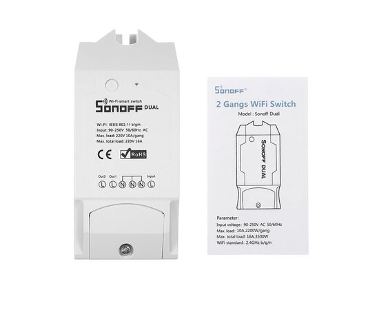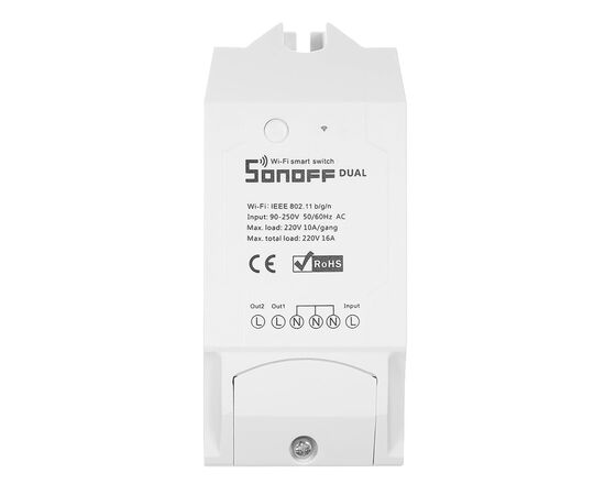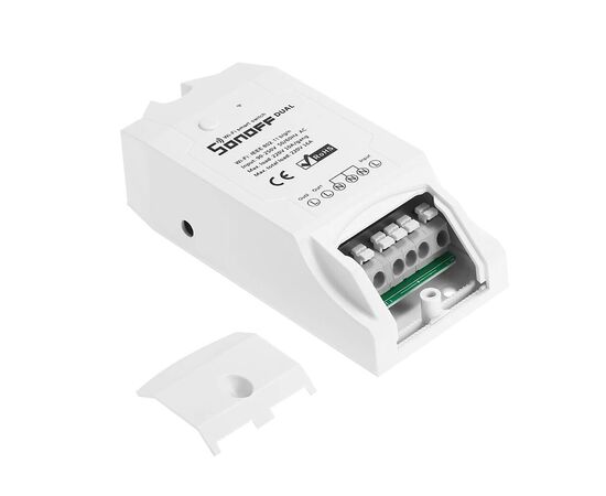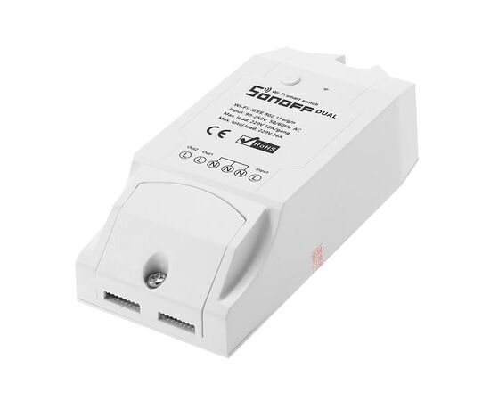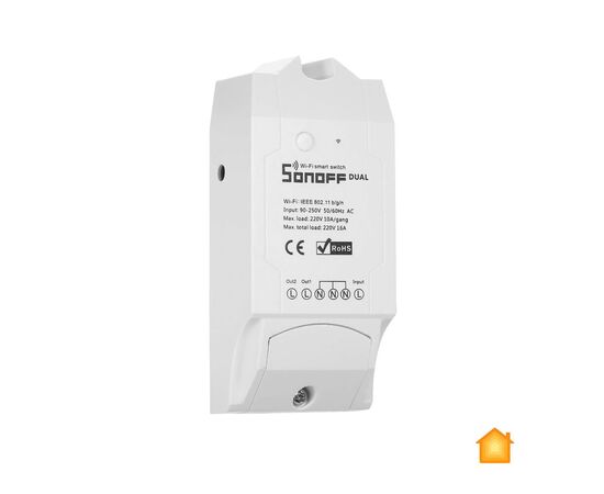 Wi-Fi реле Sonoff з двома каналами використовується для керування живленням пристроїв, що працюють від мережі. Після встановлення Dual R2 підключається до екосистеми розумного будинку Apple HomeKit, щоб Ви отримали доступ до контролю електроприладів через мобільний додаток "Дім". Таким чином, вся Ваша звичайна побутова техніка буде наділена "розумними" функціями.