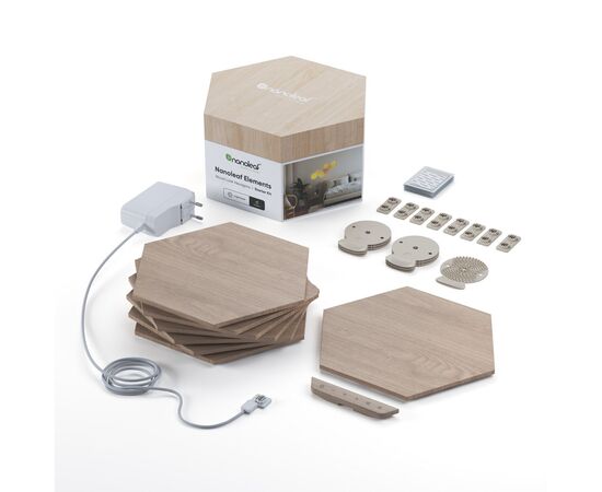 Комплект системи освітлення Nanoleaf складається з 7 дерев'яних світлодіодних панелей, 8 смужок двосторонньої клейкої стрічки для настінного монтажу, 8 конекторів для скріплення панелей і контролера і 7 монтажних пластин. Також в комплект входить керуючий блок, блок живлення та документація.