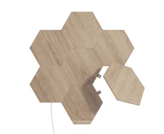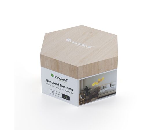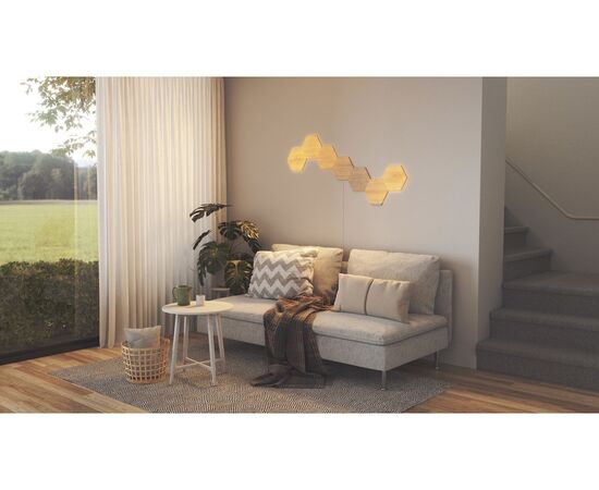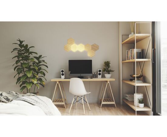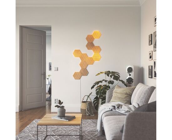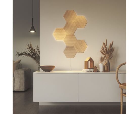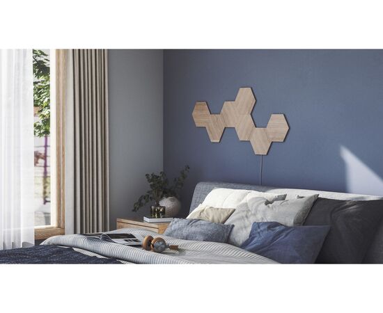 Декоративні світлові панелі виконані в дерев'яному стилі, завдяки чому виглядають витончено і затишно, стаючи не тільки зручною частиною системи освітлення, але і креативним елементом інтер'єру кімнати. Управління освітленням відбувається як за допомогою доторків до сенсорних кнопок, так і дистанційно через встановлене додаток Nanoleaf App.