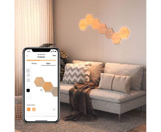 Перевагою Nanoleaf Elements виступає можливість створення індивідуальних світлових комбінацій. Модульні панелі кріпляться на стіну один за іншим в будь-якому напрямку, дозволяючи користувачеві не обмежуватися стандартними фігурами і проектувати улюблені композиції для прикраси кімнати.