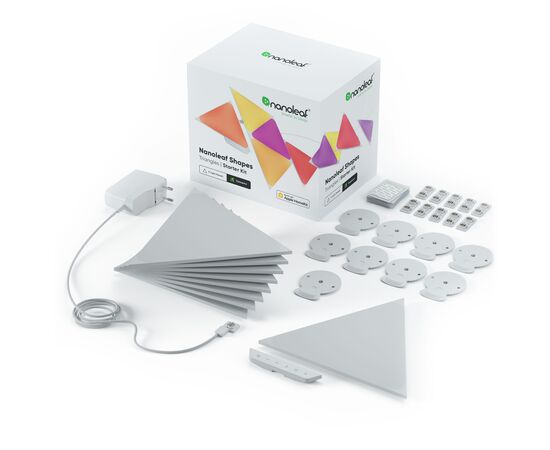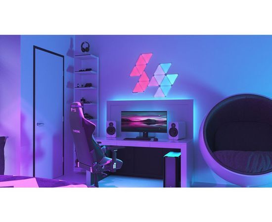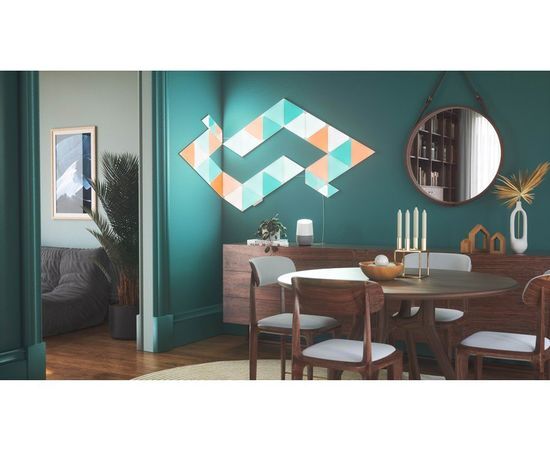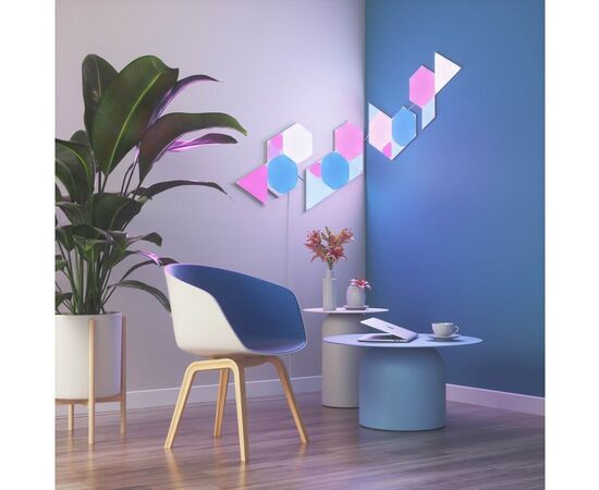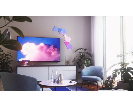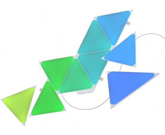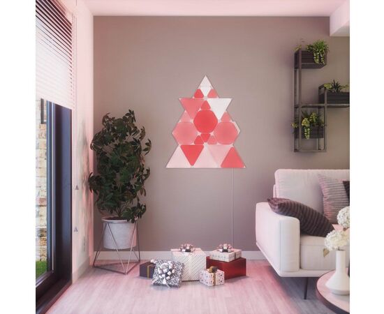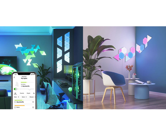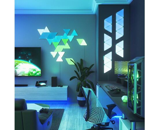 Світлодіодні панелі Nanoleaf виготовлені у формі трикутників, з яких створюються світлові комбінації для оздоблення приміщення. Комплект складається зі світлових панелей, монтажного комплекту та модуля управління, щоб пристрій підтримував дистанційне керування через мобільний додаток та голосовий помічник. Кожна панель здатна підсвічуватись вибраним кольором, тоді як інші елементи випромінюють інші відтінки. Завдяки створенню колірних композицій Ваше житло перетвориться на особливе місце, де атмосфера завжди відповідатиме Вашому настрою, самопочуттю та діяльності.