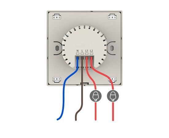 Корпус оснащений двома перемикачами для керування двома лампами. Максимальне навантаження на кожний перемикач складає 400 Вт. Встановлюють пристрій у монтажну коробку в стіні. Міцний зносостійкий пластик стійкий до утворення подряпин і легко очищується. Класичний дизайн не привертає зайвої уваги та підходить під будь-який інтер'єр.