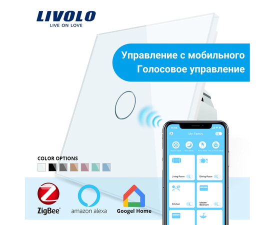 Вимикач Livolo призначений для дистанційного керування джерелами освітлення в розумному будинку. Перевагою пристрою виступає робота через 2G, 3G, 4G і WiFi. Розумний прилад підключається до шлюзу C700ZW-12. Для підключення потрібно встановити додаток Livolo Smart Home APP на iOS або Android, після установки користувач отримує доступ до віддаленого включення і виключення світла, зміни параметрів освітлення. Також встановлюються автоматичні сценарії роботи для підключених світильників, щоб автоматизувати систему освітлення будинку.