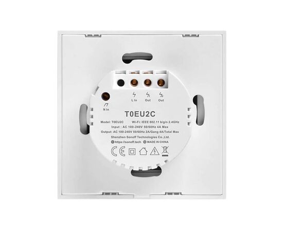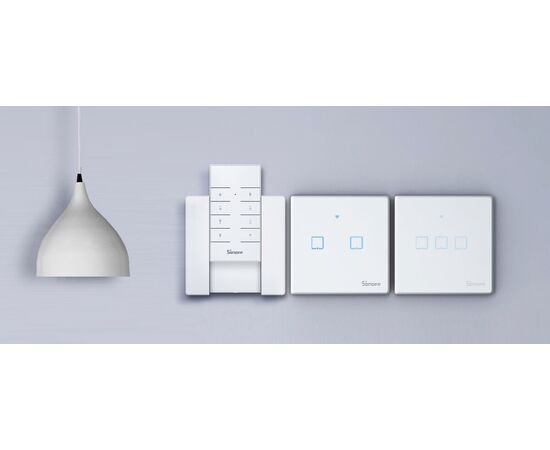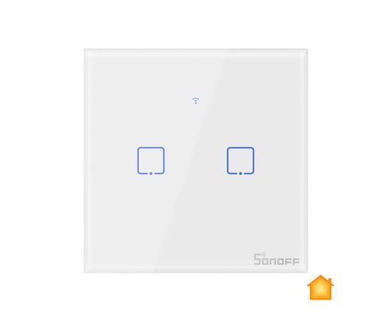 Сенсорний настінний вимикач Sonoff виготовлений у чорному та білому кольорах, щоб користувач підібрав відповідний зовнішній вигляд під інтер'єр свого житла, не порушуючи гармонію простору. Лицьова панель пристрою оснащена двома сенсорними кнопками для увімкнення та вимкнення ламп. Прилад сумісний із платформою Apple HomeKit та підтримує спільну роботу з іншими інтелектуальними гаджетами.
