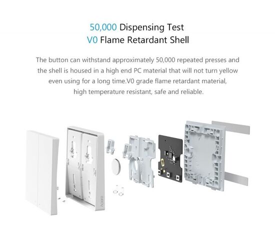 Пристрій швидко реагує на торкання та витримує до 50 тисяч натискань. Корпус виготовлений із UV-матеріалів, що гарантує довговічність експлуатації без зміни кольору вимикача. Бездротова конструкція допускає встановлення та пересування у будь-яке зручне місце.