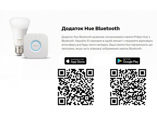 Регулювання рівня освітлення доступне в мобільному додатку. Користувач може встановити яскраве денне або тьмяне нічне освітлення виходячи з особистих бажань і часу доби. Для спільної роботи з іншими освітлювальними приладами Philips Hue потрібне підключення шлюзу Hue Bridge (не входить до комплекту).