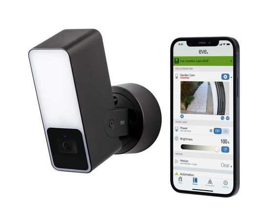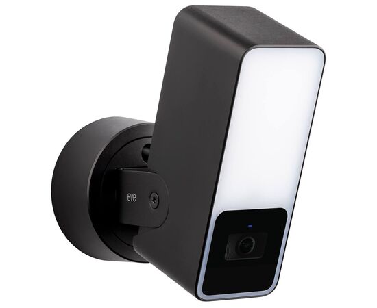 Угол обзора составляет 157 градусов. Инфракрасный датчик обеспечивает четкое ночное видение. Отснятые видеокамерой записи сохраняются в iCloud на протяжении 10 дней и доступны для просмотра в Apple Home на любом устройстве. Eve Outdoor Cam оснащена прожектором с усилением света, угол наклона регулируется. Светодиодный индикатор на корпусе отображает состояние устройства. Питание осуществляется от сети.