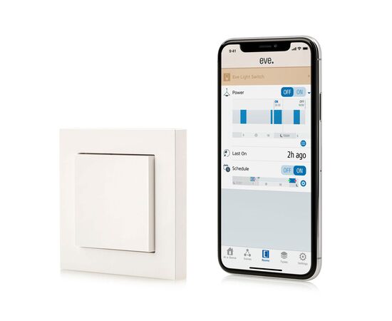 Выключатель Eve Light Switch устанавливается на стену в помещении для управления освещением умного дома. Устройство поддерживает дистанционное управление светом через мобильное приложение. Функция установки расписания позволяет синхронизировать освещение с солнцем и луной, чтобы лампы автоматически включались и выключались, следуя графику. Например, настраивается включение освещения в доме на закате или выключение перед тем, как все члены семьи ложатся спать.
