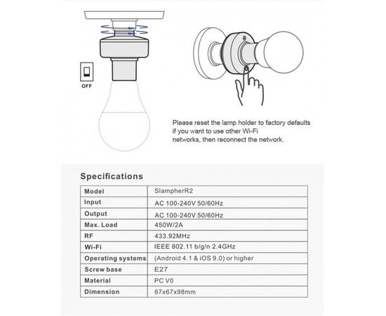 Патрон Sonoff SlampherR2 устанавливается в потолочные светильники, торшеры, бра и настольные лампы для подключения классических лампочек к системе умного дома. После подключения открывается дистанционное управление освещением через мобильное приложение и голосовой помощник. Устройство работает с Apple HomeKit, настройки осуществляются через приложение "Дом". Также патрон поддерживает функцию контроля света через пульт дистанционного управления на частоте 433 МГц.